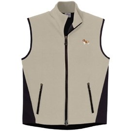 Sleek, modern and very comfortable. Soft Shell Vest. 96% Polyester 4% spandex outer shell coated with 8,000mm waterproofness/700gm breath ability. 100% polyester jersey backing. Three layer soft shell construction, full front zipper with our bone zipper pull. Two zippered pockets. Shock cord drawstring at hem. Inside pocket for a personal compact audio device. We directly embroidering a smaller version of our beautiful Cavalier MINI on the left chest, and our exclusive paw/bone on the back. Color: Blue/Black.