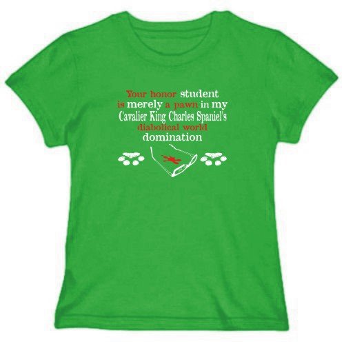 T-Shirt Womens Green " Your honor student is merely a pawn in my Cavalier King Charles Spaniel's diabolical world domination " Dogs Review