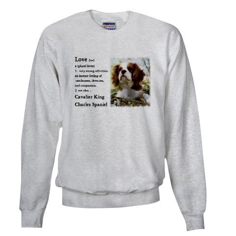 Text reads, love luv n plural loves 1. very strong affection: an intense feeling of tenderness, devotion, and compassion 2. see also, Cavalier King Charles Spaniel. Awesome Gifts. Pets Tee, TShirt, Shirt. About our Sweatshirt: Warm up in our stylin' Hanes Heavyweight 90/10 cotton/polyester sweatshirt. Thick but not bulky, for maximum comfort and durability whether you're working out or hanging out. 10.1 oz. patented PrintPro174; fabric in a 90/10 cotton/polyester blend . Standard fit. Spandex trim in cuffs and waistband ..